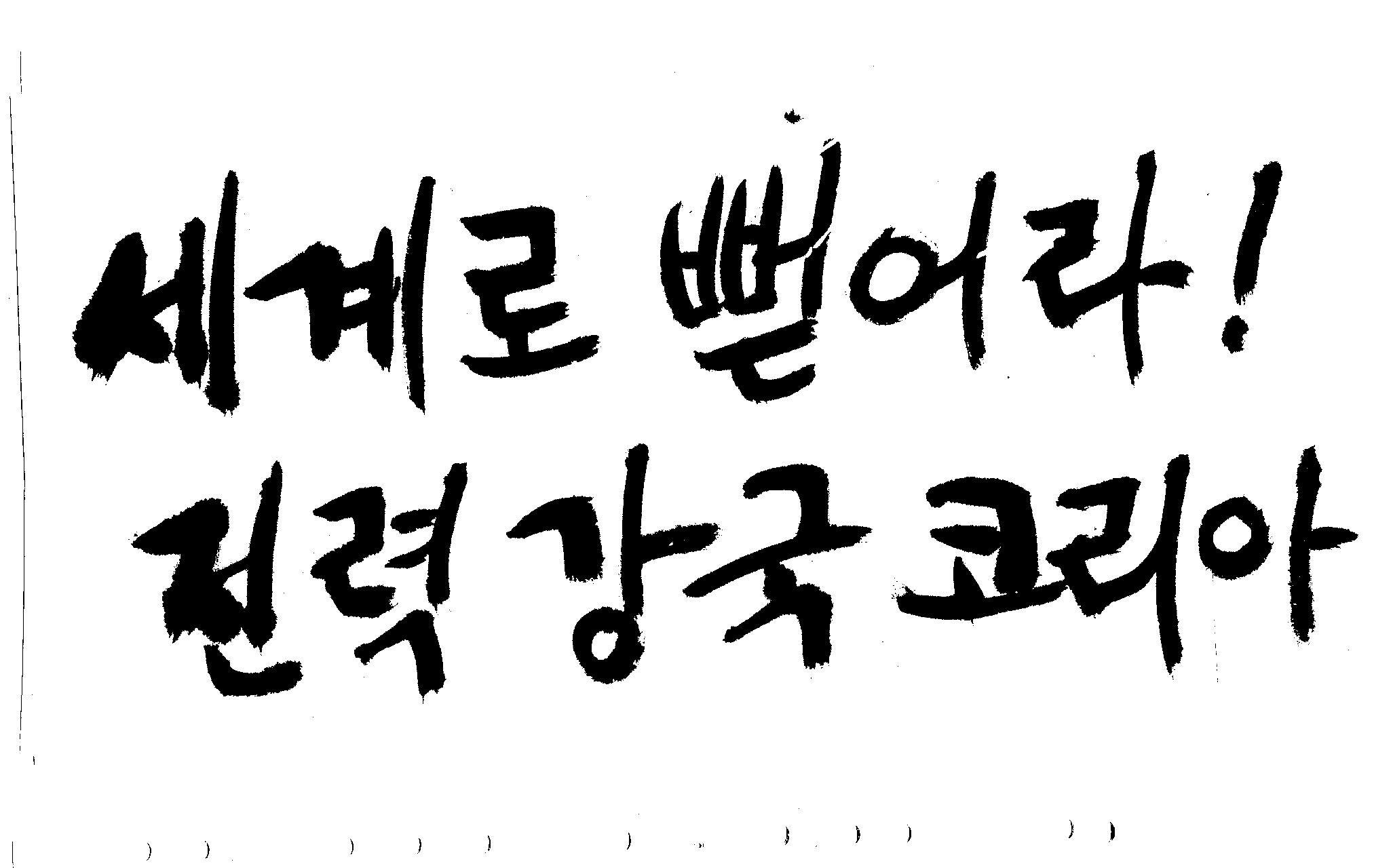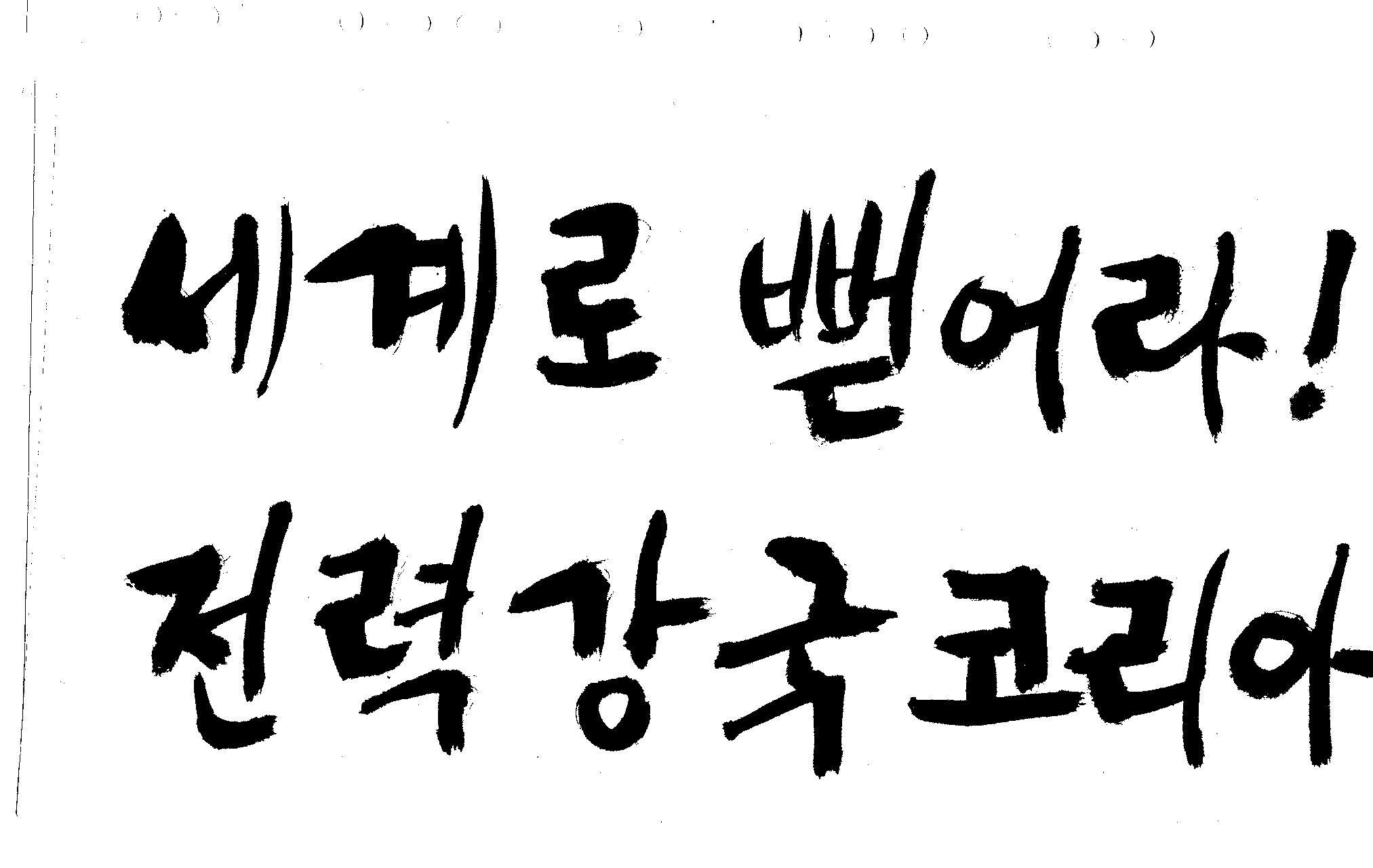 캘리 좀 부탁드려요!~ 김철호 일반 1 10633 2008.12.24 12:09 > > > > > 전력회사 신문광고를 하는데요 캘리로 멋지게 하고픈데 > > 캘리프로그램으로 아무리 써도 느낌이 안나옵니다 ㅜ.ㅜ > > 이런걸 부탁한다는 자체가 너무나도 염치없지만 부탁드립니다. > > > > 세계로 뻗어라! 전력강국 코리아 > > > 보기는 쉬워도 하기는 어려운게 > 세상 모든 일 일겁니다. > 그중에 캘리그라피가 그런것 일 겁니다... > 스캔중에 글꼴이 잘린것은 서로다른글꼴서 편집하시길... > 글수가 많아서 어쩔 수없네요... >